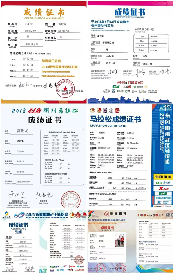 工作的繁忙阻擋不了雷世龍參加馬拉松的決心,為了順利完成今年六月份的蘭州雙金跑馬賽事,雷世龍現(xiàn)在每天都要堅持完成三十公里的跑步計劃,當(dāng)談及跑馬對工作的影響時,雷世龍笑著說:“跑步賦予我們的不僅僅是強健的體魄,更多的是對精神的磨煉,唯有努力奔跑,才能讓人永葆激情和活力,才能更好地面對工作中的挑戰(zhàn)和困難。公司對我參加馬拉松是非常支持的,從帶薪休假到物資支持,為我提供了很多便利。同時我也希望自己能給年輕員工做一個表率,愿我們每一個榮事達人都能不忘初心,保持永遠向前奔跑的決心!” - (雷世龍參加2019武漢馬拉松比賽)  - (雷世龍跑馬征程部分留影)   - (雷世龍獲得的部分榮譽證書)