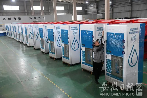 員工對(duì)準(zhǔn)備出口到智利的個(gè)性化定制產(chǎn)品售水機(jī)進(jìn)行裝箱作業(yè)